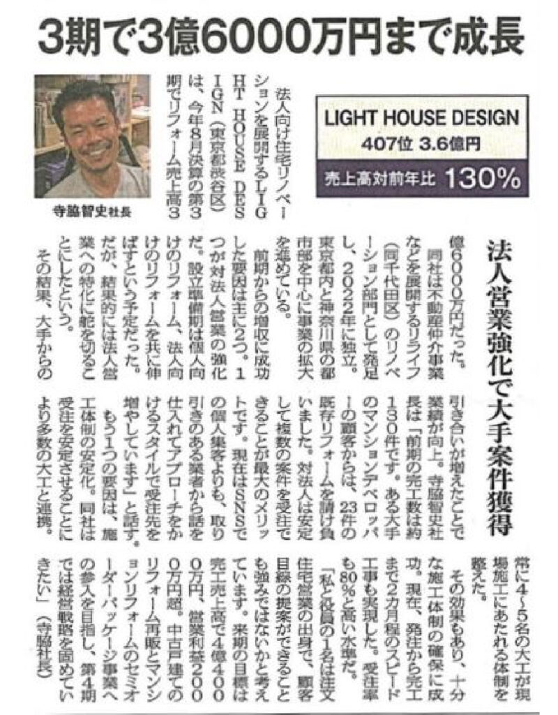 増収企業レポートリフォーム業界の専門紙「リフォーム産業新聞」第1618号(2024年9月23日号)の「リフォーム売上高ランキング2024」に当社㈱LIGHTHOUSEDESIGNが407位にランキングされ、増収企業レポートとして記事が掲載されました。